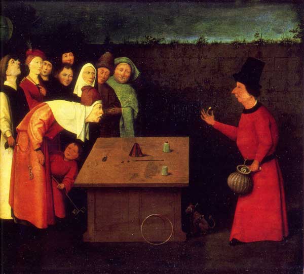 Musée Municipal, Saint-Germain-en-Laye, France. (s)Bosch, for all his depictions of suffering and inhumanity, does display a comical side to his nature in this well-observed painting. The conjurer displays his sleight of hand, an onlooker bends at the table as a frog is produced from his mouth and, while the crowd are distracted watching the show, the conjurer's assistant is busy removing the victim's purse.