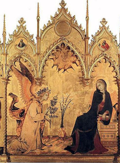 You can see from this highly gilded work that it lacks the realism of Giotto's paintings, but there is a sense of real space, the Virgin sits on a real bench and the vase of flowers occupies its own space and sits on a solid floor. The picture flows in a very graceful manner from the sweep of the Virgin's robe to the linear depiction of the Archangel Gabriel, an outstanding masterpiece!
