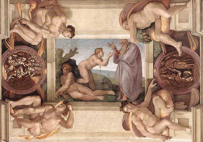 The centre of the Sistine Chapel vault is decorated with nine scenes from Genesis, four large and five small ones. Three of the episodes describe the Creation, three the story of Adam and Eve, and three tell the story of Noah. The paintings sequence is as follows, from the South end of the Chapel.